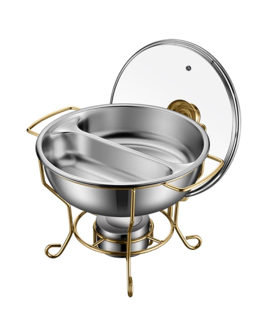 Elegant 8L golden partitioned chafing dish with cover-keeping design, perfect for serving multiple dishes at upscale events and buffets.