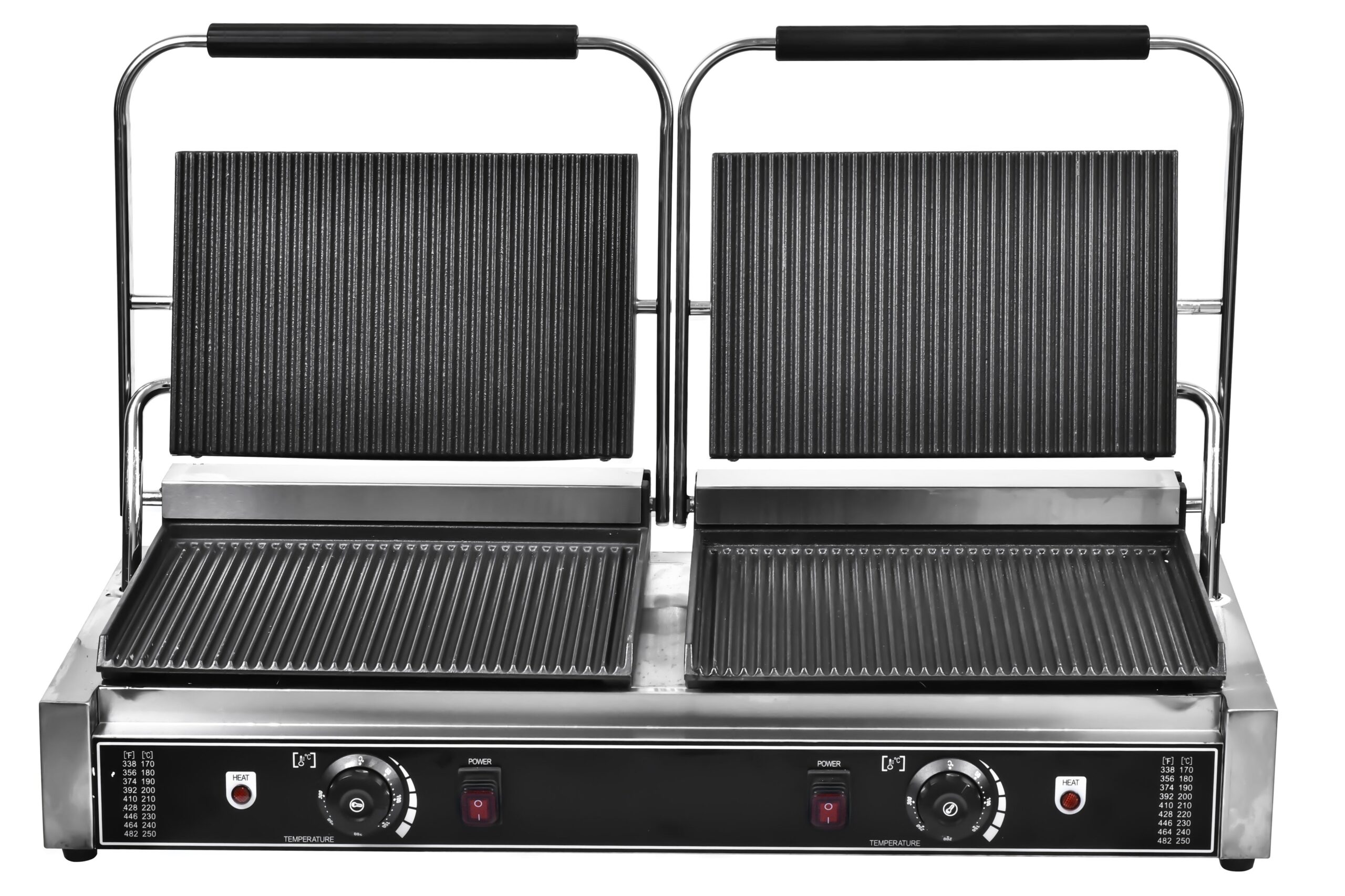 - Optimized Workflow Efficiency: Dual upper and lower plates (340*220mm ×2 / 360*240mm ×2) facilitate simultaneous grilling of multiple items, enhancing productivity and reducing serving times.