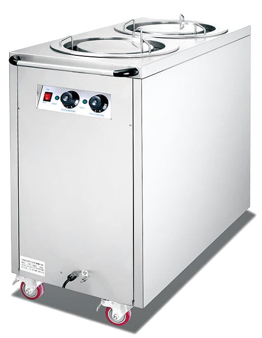 HPW-2 2-head electric plate warmer cart with 0.8KW power, stainless steel and 150-plate total capacity, ideal for high-volume service.