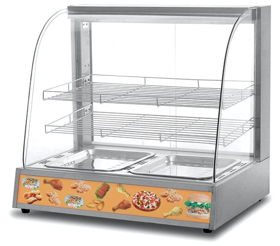 Compact food display warmer with 1.2KW power, three shelves, and dimensions of 950x495x615mm. Perfect for showcasing hot foods in cafes and buffets.