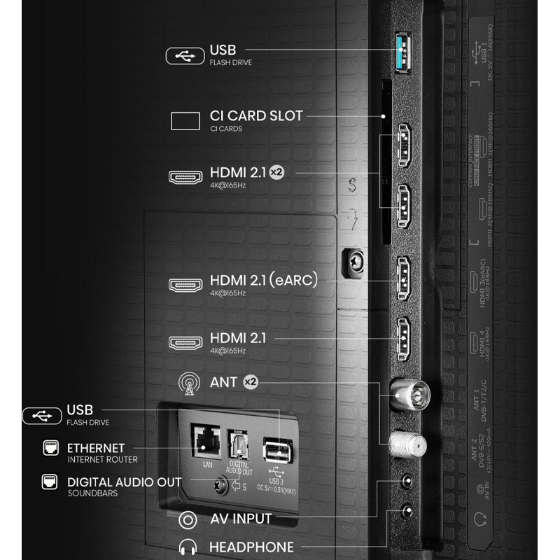 - Connectivity: Wi-Fi IEEE 802.11 a/b/g/n/ac (2.4G/5G), Bluetooth, 4x HDMI 2.1 (ALLM/VRR 165 Hz, one with eARC), 1x USB 2.0, 1x USB 3.0, Ethernet (RJ45)