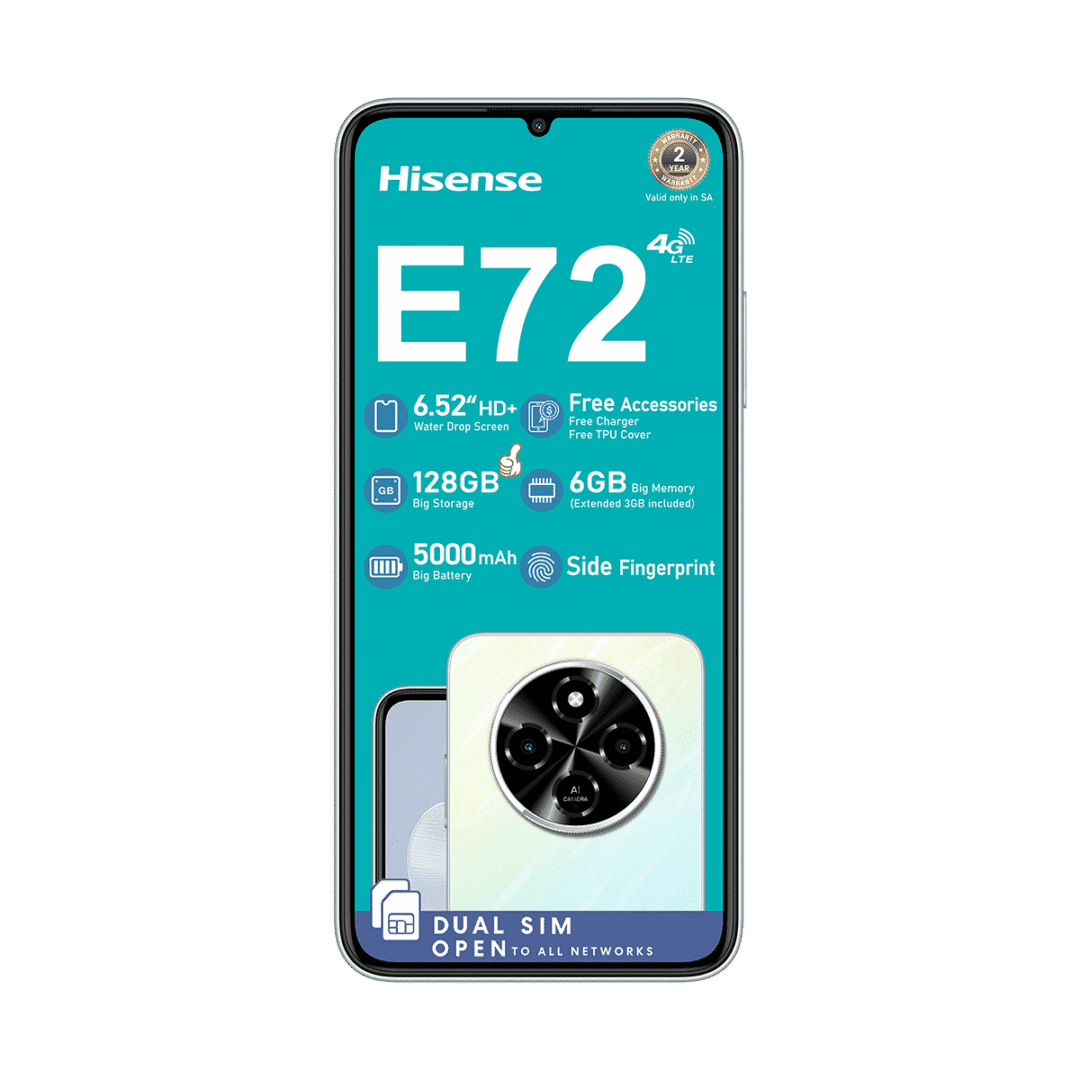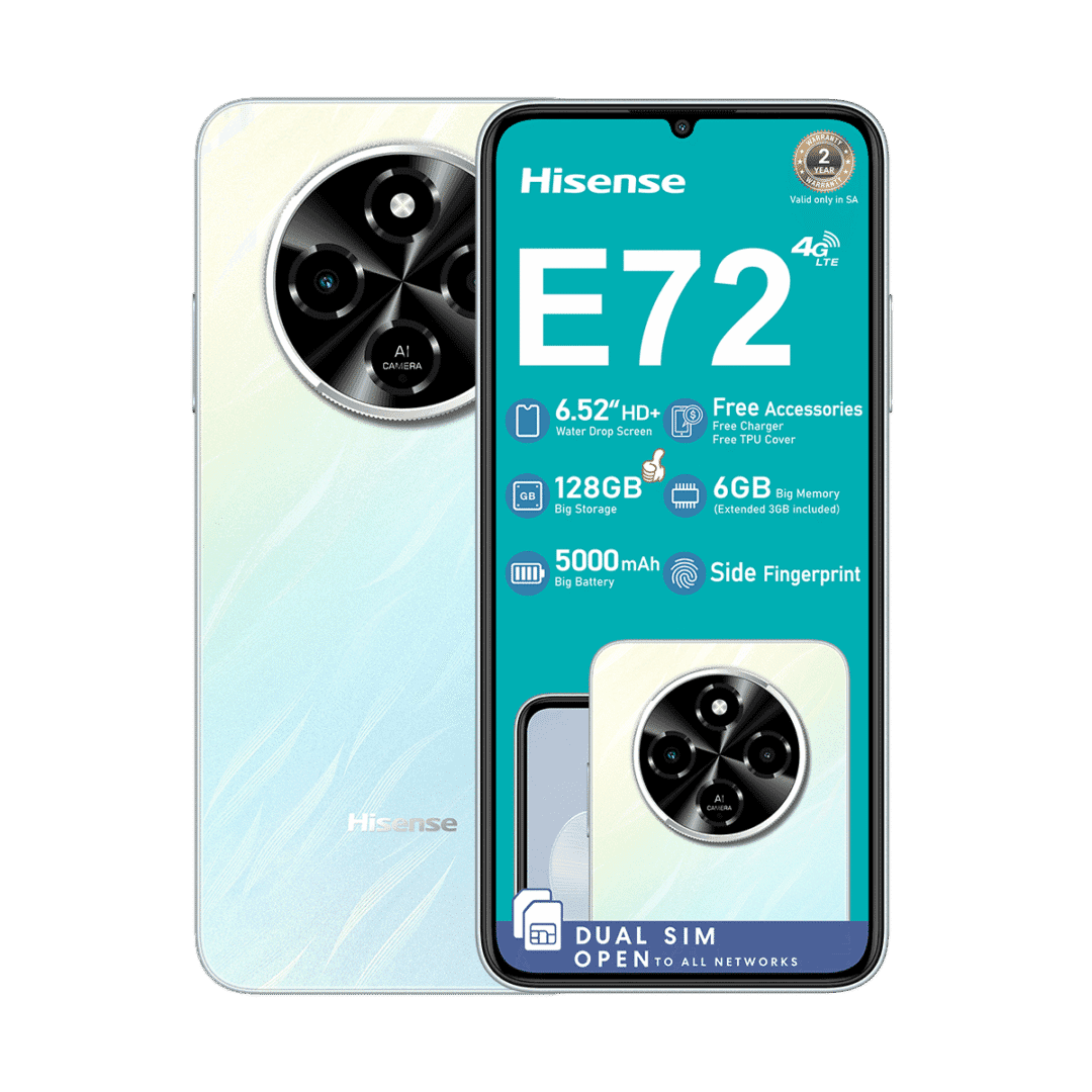 The Hisense E72 128GB Dual Sim features a 8MP Front Camera, 6.75″ Screen, 64MP Main Camera, 5000mAh battery and 128GB of storage with 3GB + 3GB Extended RAM.